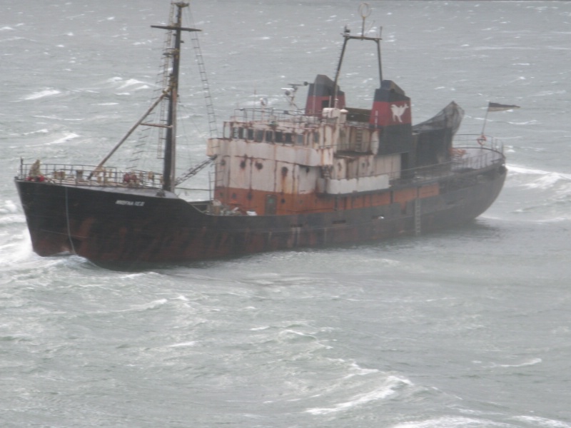 Búið er að koma taug í skipið og snúa því uppí ölduna. Dráttarbáturinn heldur í skipið á meðan unnið er að ná akkerum upp. Köfunarþjónustan er með menn um borð ásamt einum skipsmanni. Þegar dráttarbáturinn kom á staðinn var farið að falla að og skipið farið að færast nær landi. Lítur nú vel út með björgun skipsins.