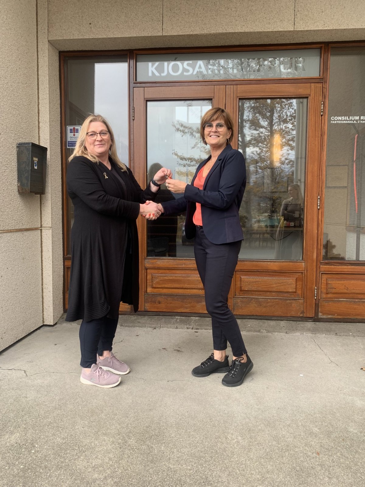 Á myndinni má sjá Jóhönnu Hreinsdóttur oddvita, afhenda Þorbjörgu lyklana af skrifstofu sveitarstjóra.