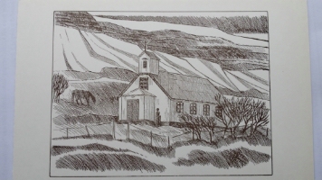 Tækifæriskort Reynivallakirkja byggð 1859-60, stækkuð og endurbyggð 1959. Grafíkmynd: Einar Hákonarson 1983 |
