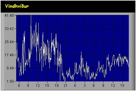 Mikil sprenging varð í heimsókn á Veðurstöðina á Kjósarvefnum á föstudaginn þegar óveðrið gekk yfir. Heimsóknirnar meira en tífölduðust. Mældist mesta vindhviðan um 42 m/s. Hér að neðan sést línurit yfir vindhviðurnar frá föstudeginum 9 okt. og fram á laugardaginn.